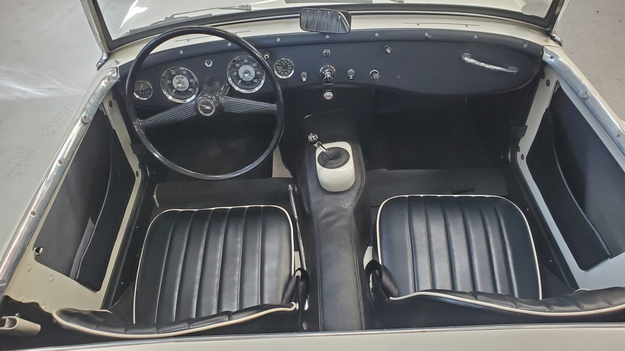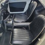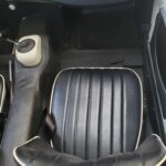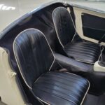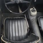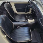 The interior is also excellent, in correct black with white piping, just like when new. It is also fitted with a premium hardura tunnel mat in matching black (which we sell here in our parts catalog). This mat more closely matches the original rubber mat than the carpet you usually see in restored cars.