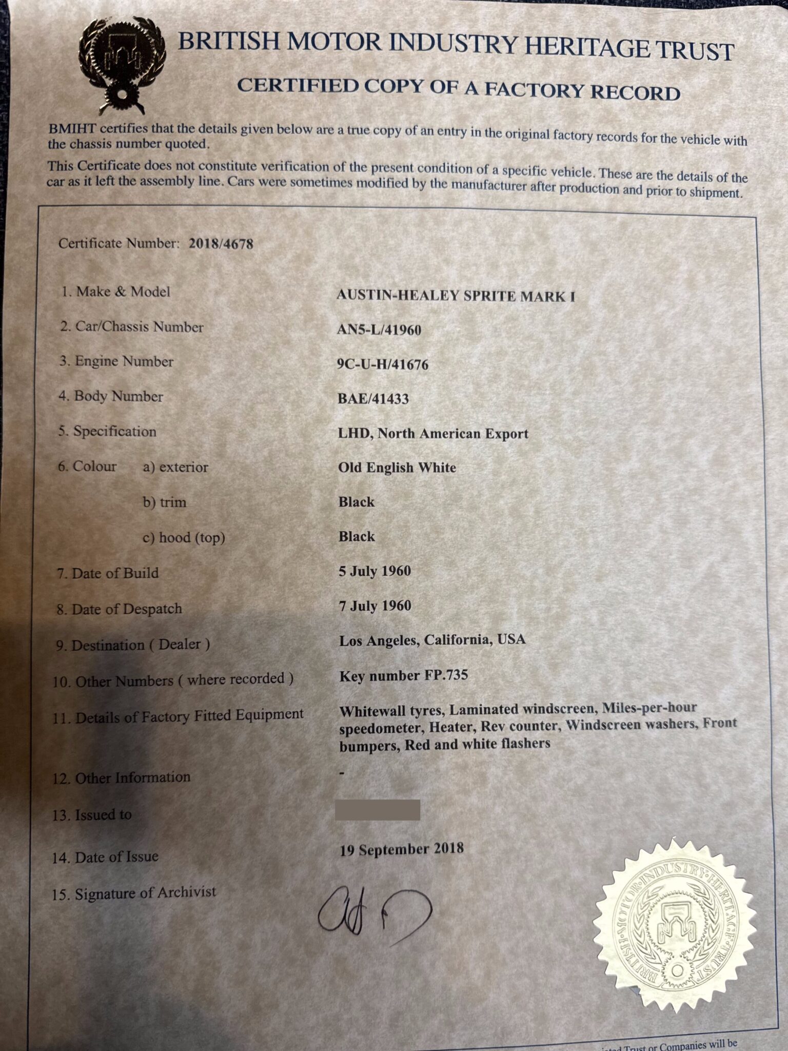 “Calvin” (AN5L 41960) was a lifetime California car until the current owner purchased it a year ago at a Bonhams auction. The car is almost completely stock, with 948 engine, drum brakes, and bias ply white walls, just as is indicated in the heritage certificate (below) that is included in the sale of the car.