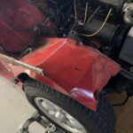 The nose is from another car-the red nose belonging to the car originally was destroyed in the accident. There is some work to be done with the inner fenders (we have the parts if you want to cut the right inner fender off and weld on a new one). Work needs to be done at the collision shop to straighten the frame rails and realign the two front wheels.