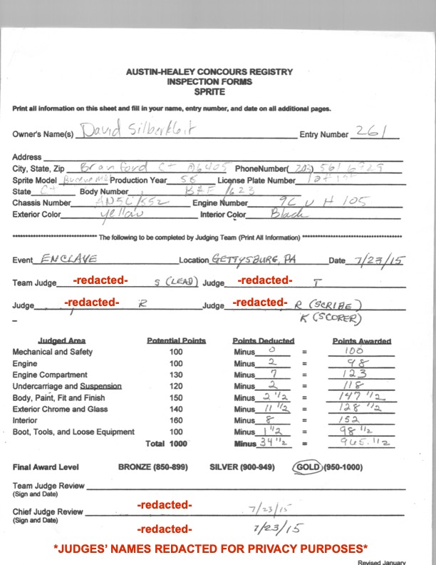This car was awarded 967 1/2 points and impressed the judges, given the car’s accuracy and uniqueness. We chose this car to run through the concours process because it is historically very significant, and believed to be one of the earliest Sprites, a pre- production car used when the car was introduced to the media in early 1958 before the first production Bugeye Sprite, was released.