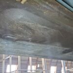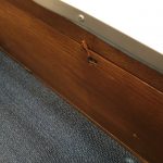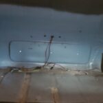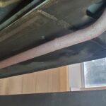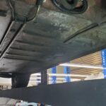 The underside is solid on this car. The passenger side rocker panel is a bit rumpled. The story that came with the car is that the rocker was replaced by a prior owner and damaged in shipping but still installed anyway because the eventual repaint prep would smooth it out anyway. I can find no crash damage.